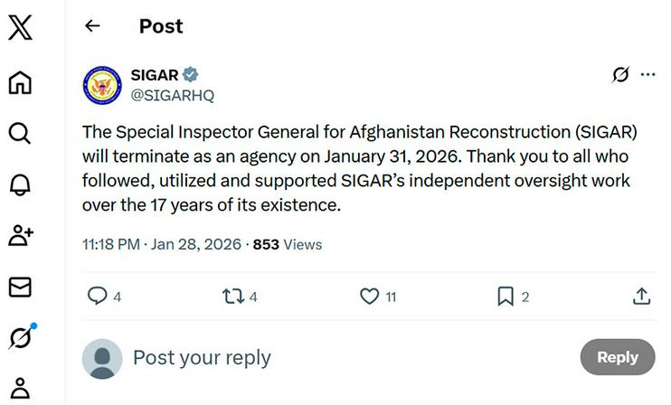 «L'Ufficio dell'Ispettore Generale Speciale per la Ricostruzione dell'Afghanistan (SIGAR) cesserà le sue operazioni il 31 gennaio 2026. Ringraziamo tutti coloro che hanno seguito il lavoro di supervisione indipendente del SIGAR, utilizzato le sue risorse e lo hanno sostenuto durante i suoi 17 anni di esistenza», si legge nel post.